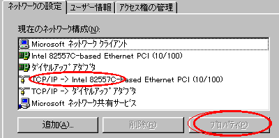 2)下図の○で囲んだ様に、「TCP/IP・・・」を選んで「プロパティー」をクリックします。